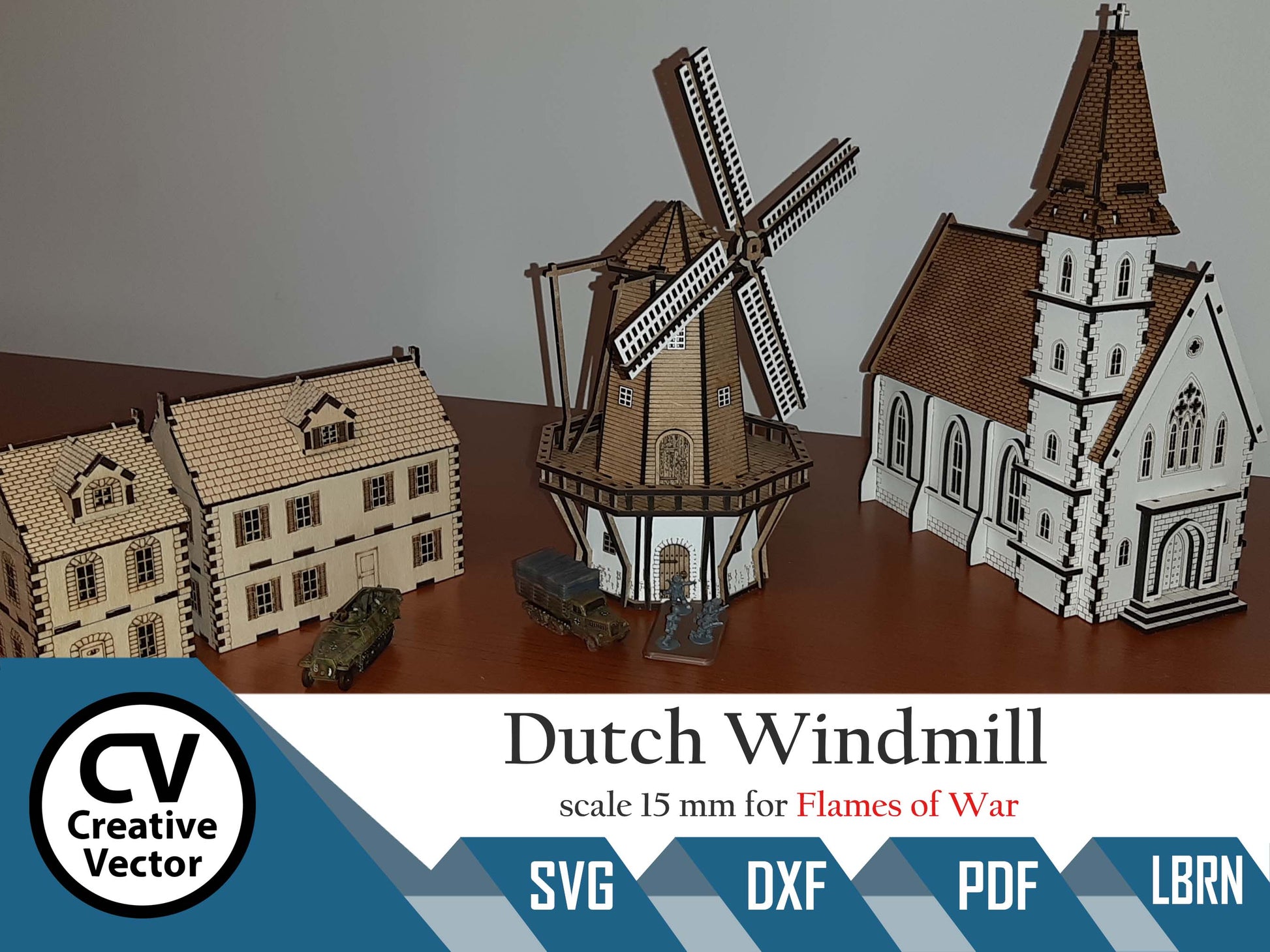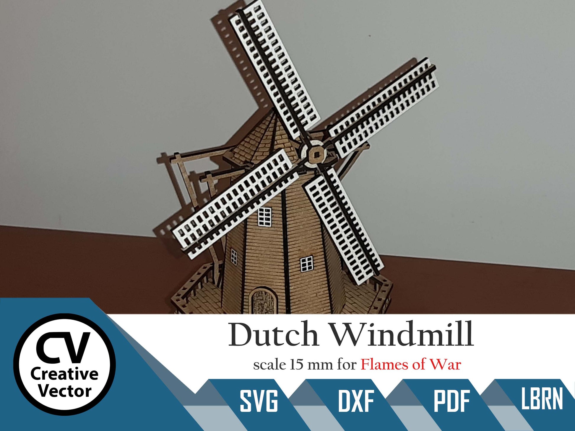 Formmuster (digitale Dateien) für Laser zum Schneiden von holländischen Windmühlenmodellen für Wargamer oder Modellbauer. Maßstab 15 mm 1:100 passt auch in die Maßstäbe H0 und 1:87